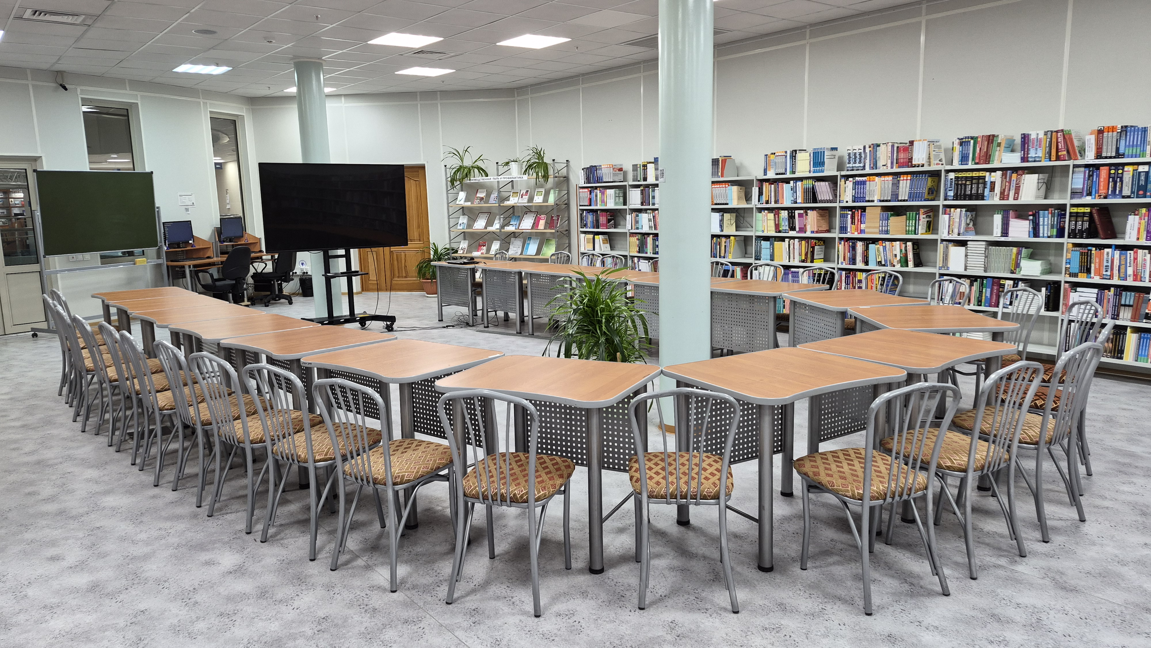 Большой стол для работы группы до 30 человек, возможность организации дополнительных 10-15 посадочных мест: 3 компьютера, телевизор, 1 ноутбук, доска магнитно-маркерная/меловая передвижная, флипчарт.